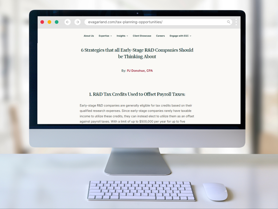 EGC’s tax team specializes in tax preparation and planning for companies engaged in research and development (R&D). We understand the complex intersection of R&D tax credits, grant funding, and government compliance, ensuring you capture every available benefit while maintaining accurate and compliant tax filings. Whether you are pursuing SBIR/STTR awards or conducting investor-funded R&D, our experts help optimize your tax outcomes.