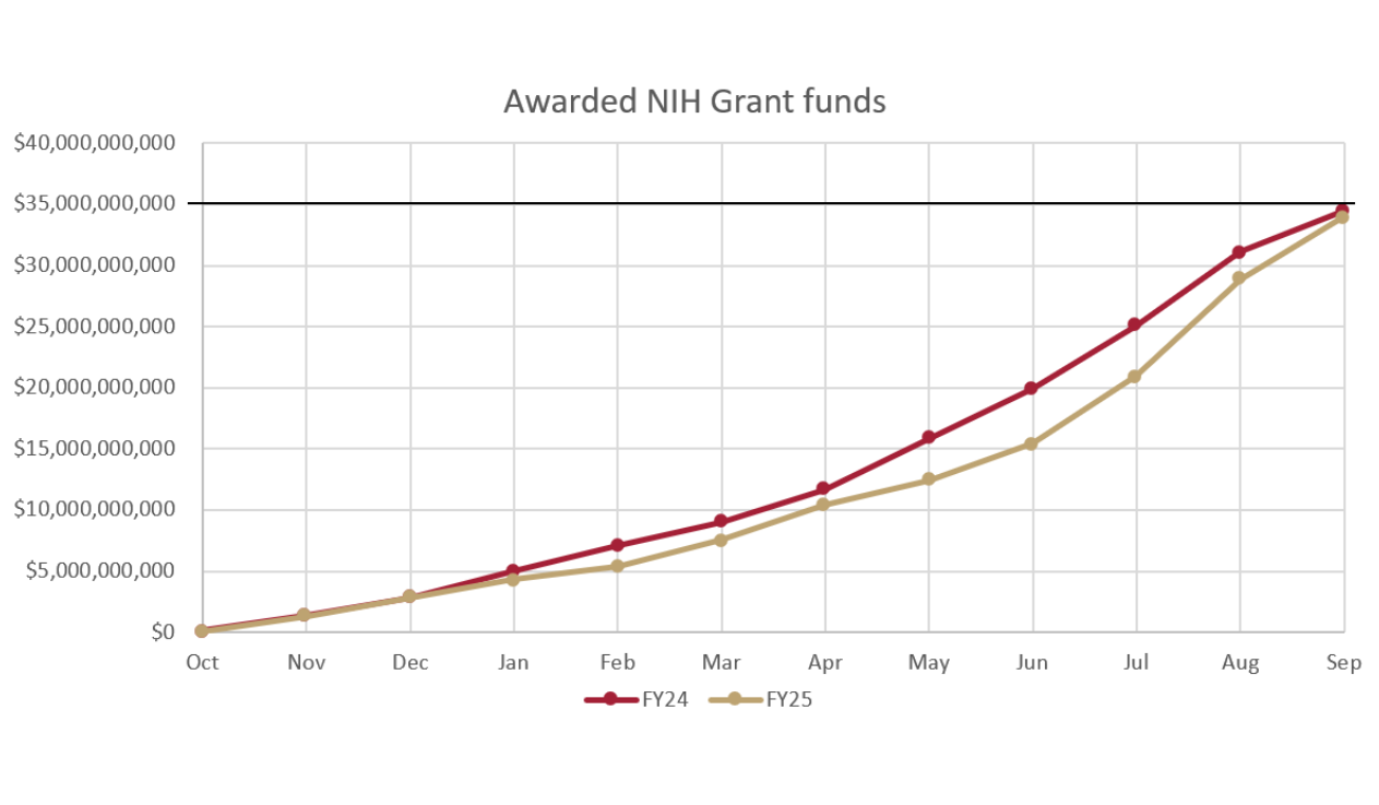 Figure 1 | Awarded NIH Grant Funds. Monthly FY25 NIH awards tracked closely with FY24 through January, then lagged from February before a late-year surge closed the gap, ending near FY24’s ~$35B total.