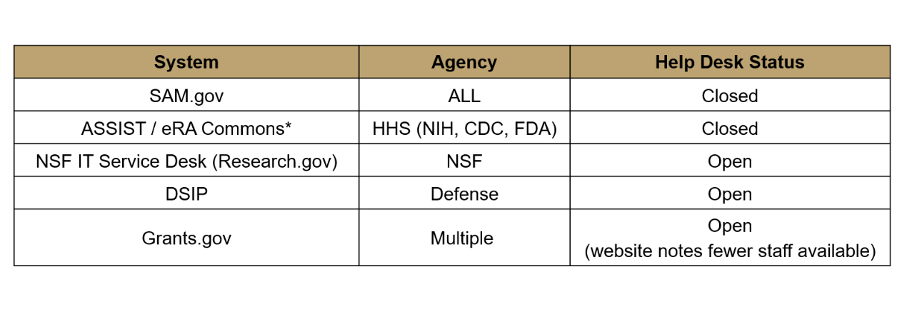 Status of Applications and Pending Awards. During the federal shutdown, electronic submission systems and help-desk support systems (including SAM.gov, ASSIST/eRA Commons, Research.gov, DSIP, and grants.gov) remain operational but agency staff availability is restricted. Applicants are encouraged to proactively file help desk tickets to time-stamp issues, document communications, and preserve their place in the queue once staff return to duty. While NIH has asked assigned reviewers to continue evaluations to minimize restart delays, Study Sections and Councils will not meet until operations resume, potentially delaying Council decisions and award issuance. For animal work, local IACUC review can proceed, but OLAW approvals are paused and awards contingent on OLAW must wait. Payment systems (e.g., NIH Payment Management System) remain available for drawdowns with short delays, though new Notices of Award generally will not be issued until the government reopens.