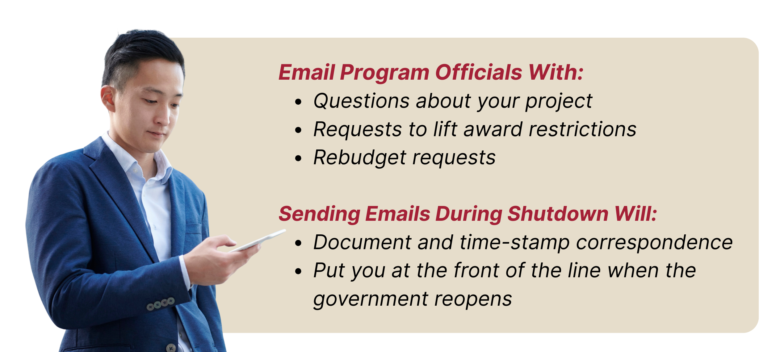 Figure 3 | When to Contact a Program Official. Email correspondence with your Program Official during the shutdown is encouraged to document your actions and potentially expedite communication upon reopening.