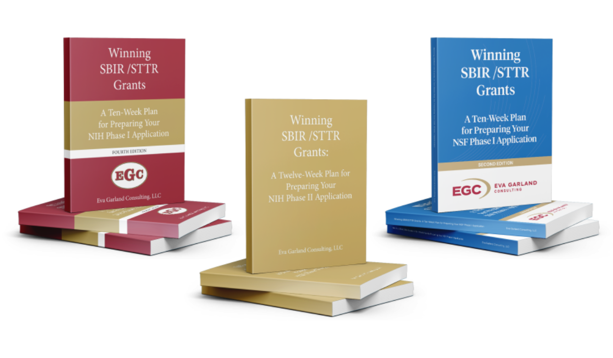 Figure 4 | EGC’s SBIR/STTR Grant Preparation Resources. Our Winning SBIR/STTR Grants series provides step-by-step guidance, timelines, and checklists to help you plan, budget, and submit competitive proposals independently. All three titles are available for purchase on our website: https://www.evagarland.com/resources/sbir-sttr/.